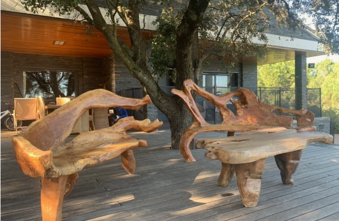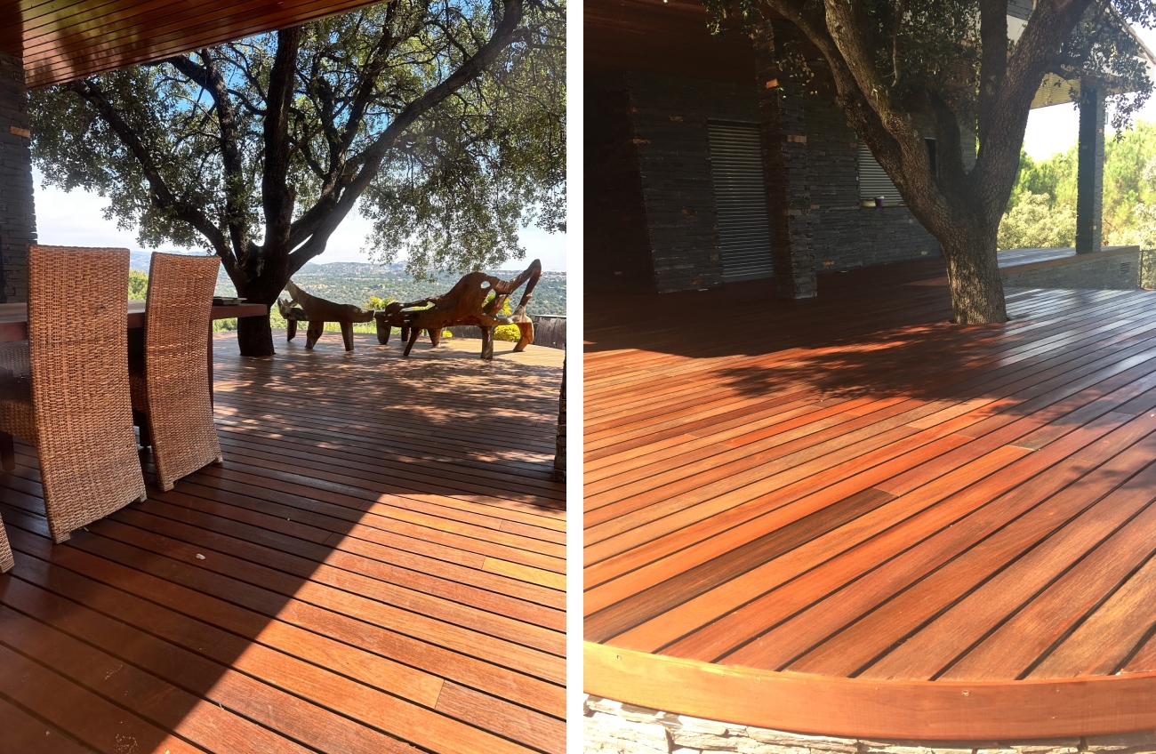 Fabricamos bancos en madera de teka, instalados sobre una tarima de exterior en Ipe y con un friso en madera de Iroco. Todas las maderas se dejaron a poro abierto, evitando el barnizado para garantizar su óptima conservación en exteriores.