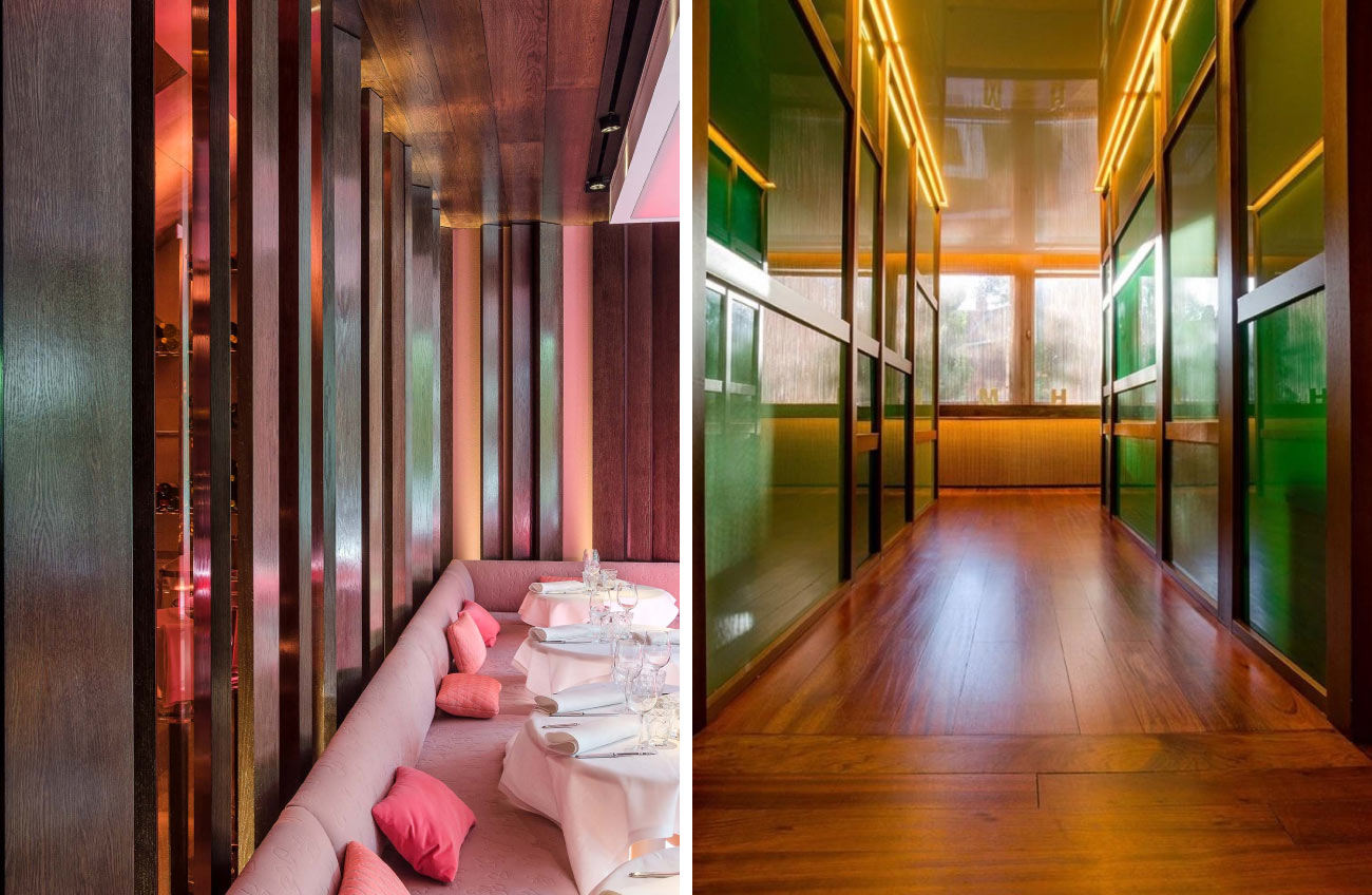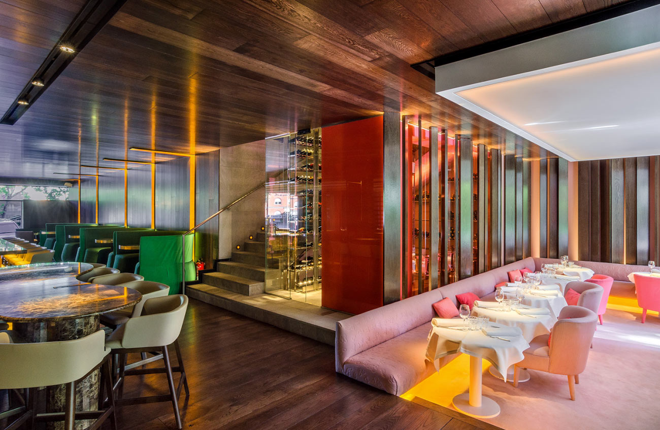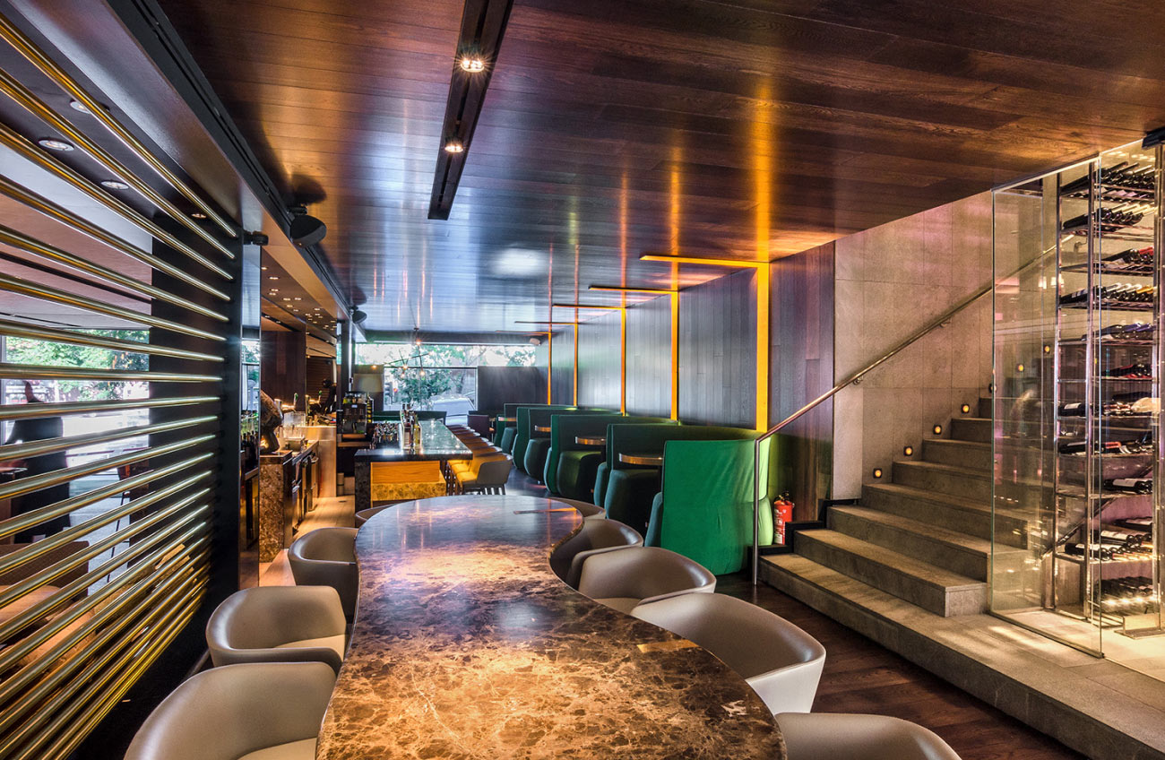 En este restaurante instalamos suelo de madera maciza de roble americano, combinando anchos con una ligera separación y un barniz oscuro. Se fabricaron peldaños en la misma madera con iluminación LED. Para reducir peso estructural, se optó por tarima multicapa en paredes y techos, manteniendo el mismo acabado.