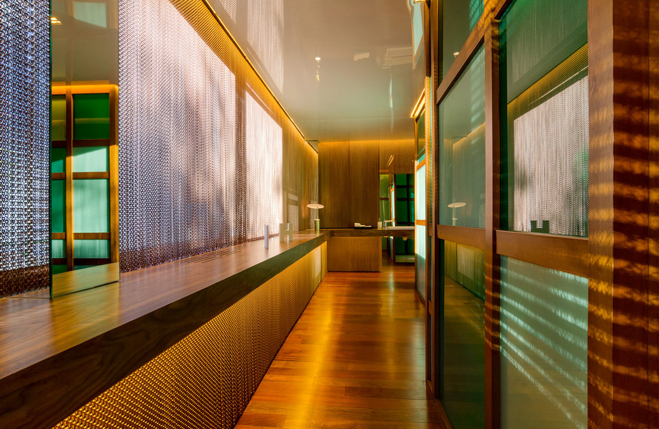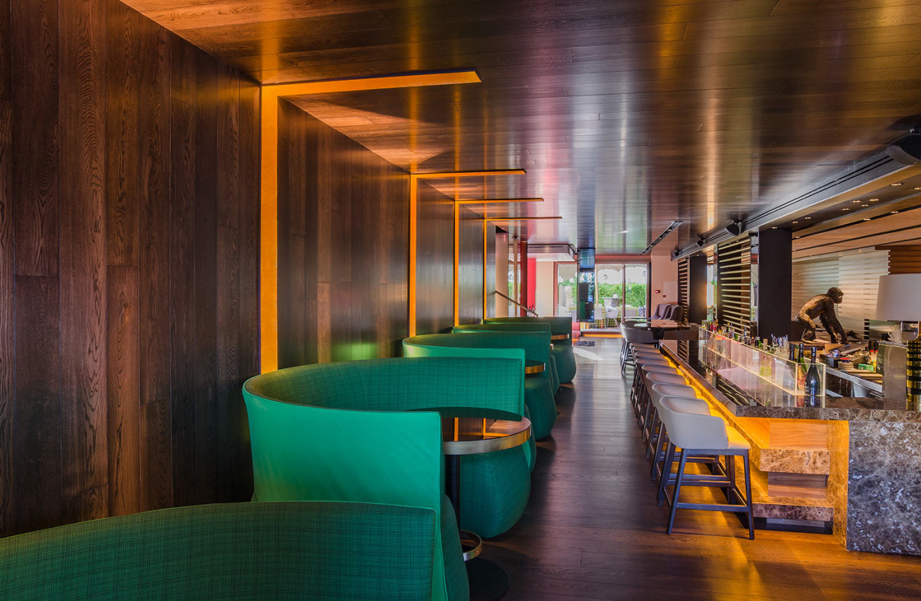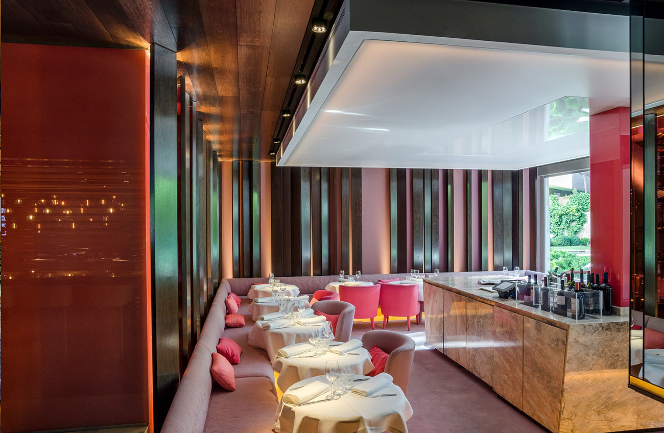 En este restaurante instalamos suelo de madera maciza de roble americano, combinando anchos con una ligera separación y un barniz oscuro. Se fabricaron peldaños en la misma madera con iluminación LED. Para reducir peso estructural, se optó por tarima multicapa en paredes y techos, manteniendo el mismo acabado.