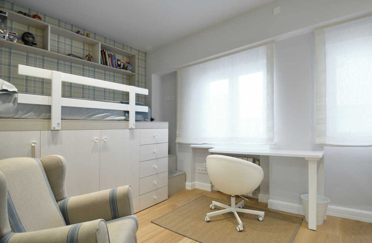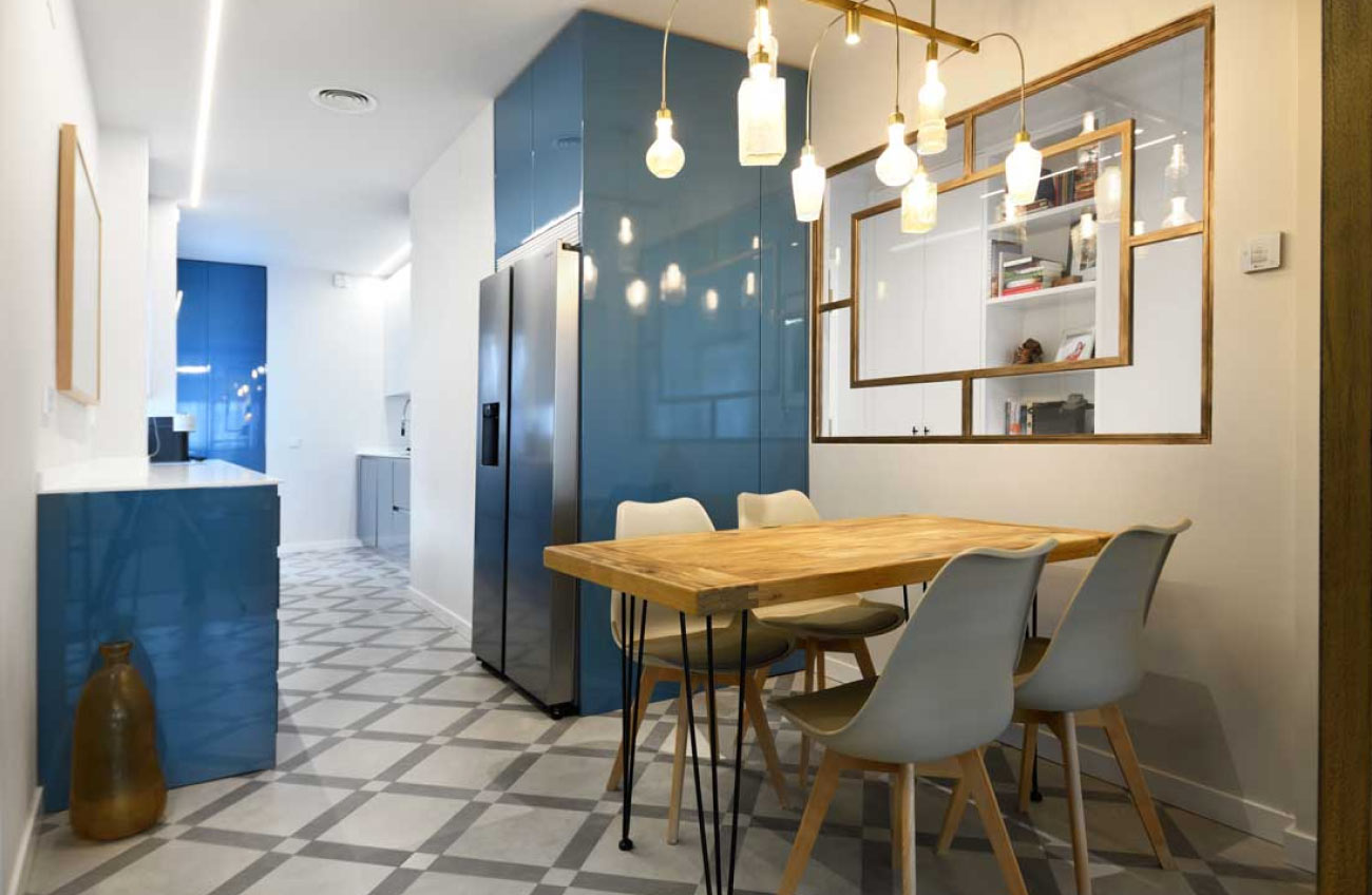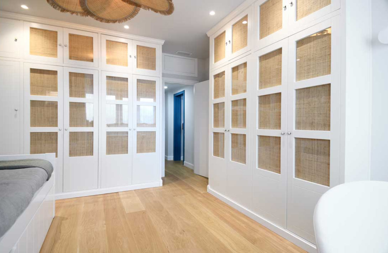 Diseñamos un mueble en madera chapada de nogal, contrastando con la encimera blanca. Consta de dos amplios cajones, aportando funcionalidad y estética a la estancia.