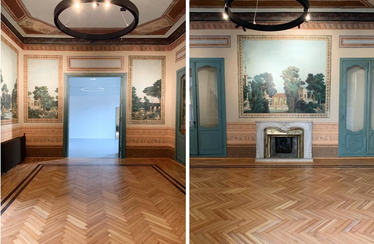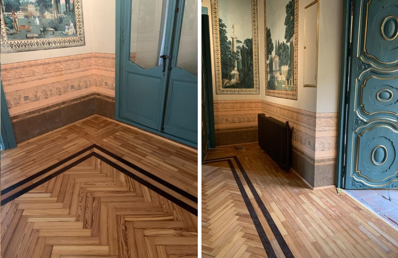 En el Palacio de Quintanar (Segovia) instalamos parquet de pino Melis viejo de primera calidad, en espiga con faja perimetral. Se incorporó madera de wengué para generar contraste en el diseño, aportando elegancia y carácter al espacio.