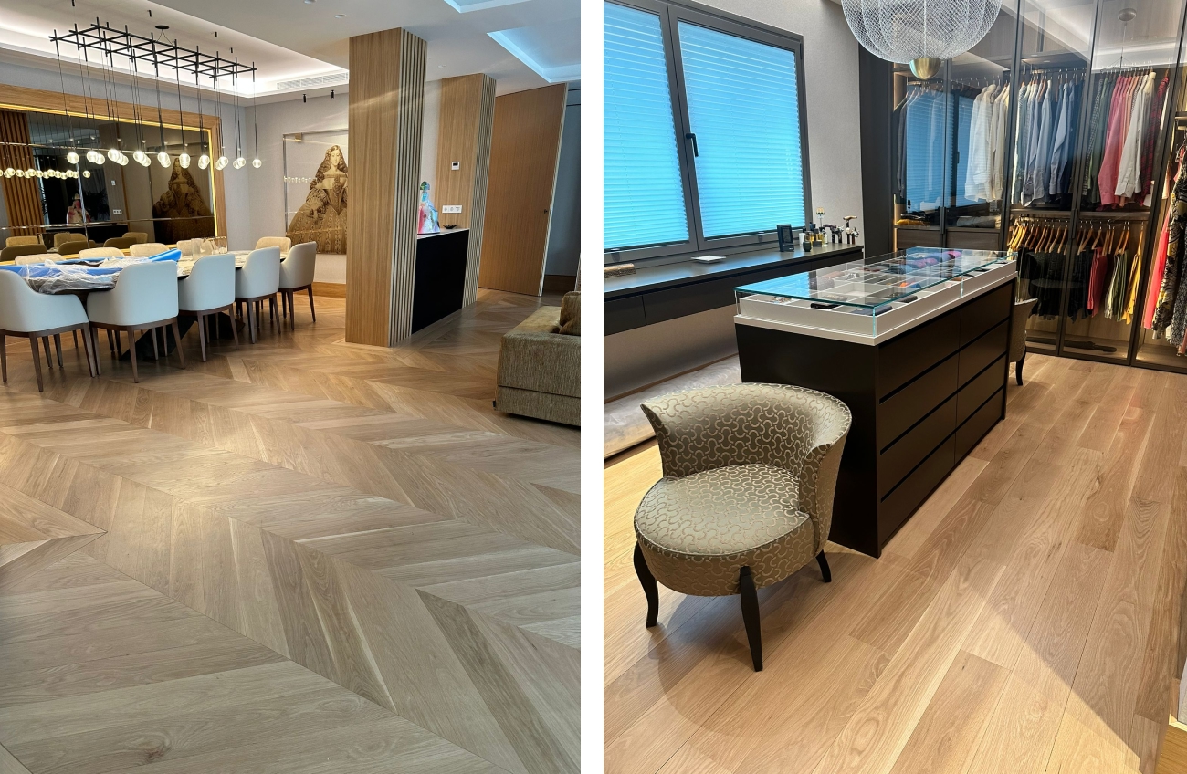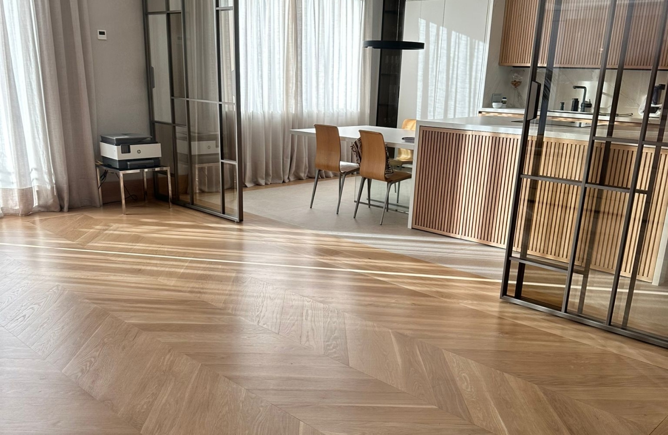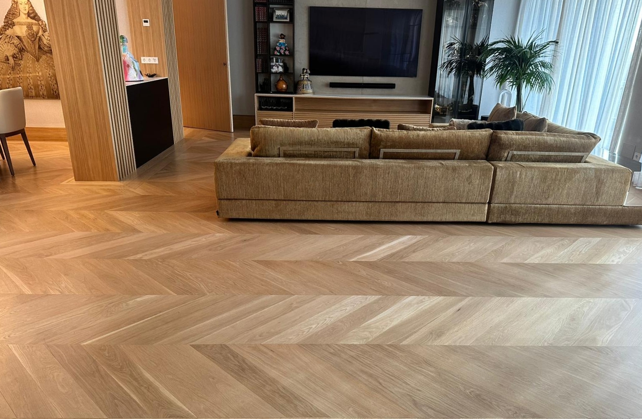 En esta vivienda particular instalamos tarima maciza de roble americano de primera calidad en punta Hungría, con faja perimetral. Se fijó mediante pegado sobre un sistema de calefacción por suelo radiante y se aplicó un barniz ecológico al agua en mate para resaltar la naturalidad de la madera.